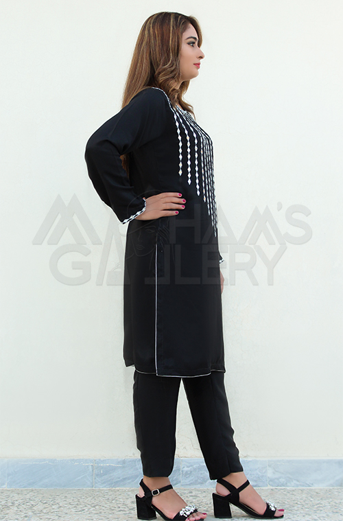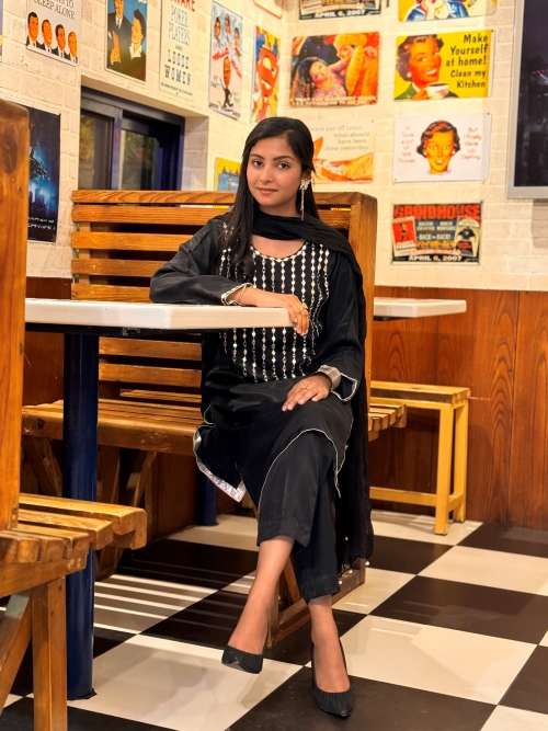 Experience the allure of pure silk with this exquisite black dress, a perfect blend of tradition and sophistication. This outfit, crafted from premium pure silk, offers a luxurious feel and an elegant drape that’s comfortable yet striking. Detailed with intricate mirror work on the front and sleeve borders, it captures light beautifully, adding just the right amount of sparkle to elevate your look.
